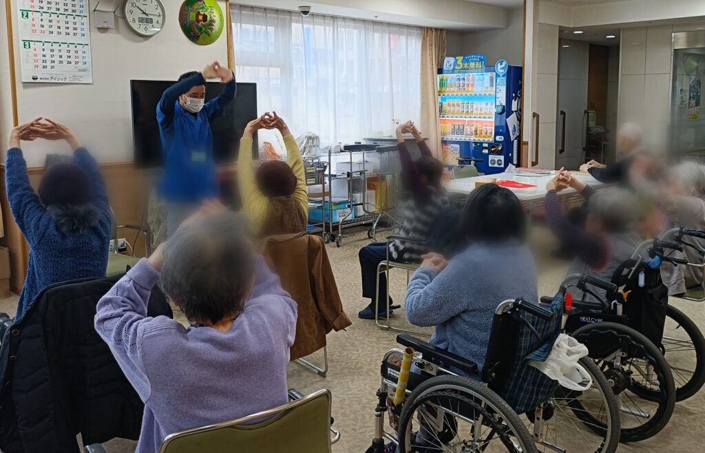 先月、南区の特別養護老人ホームケアマキス柴田様で、体操教室を担当させていただきました。当日は雪がちらつく寒い日だったにも関わらず近隣の方もご参加いただきました。